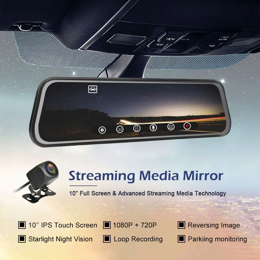 Olysine 10'' IPS Touch Dashcam Full HD 1080P Car DVR Stream Media Rearview Mirror Recorder Dash Cam