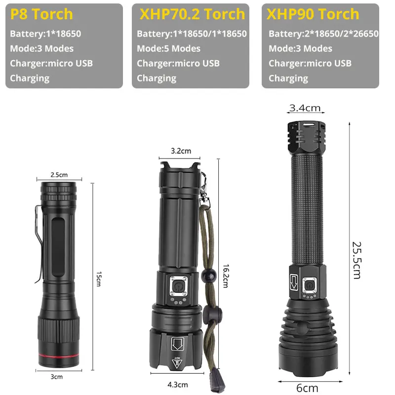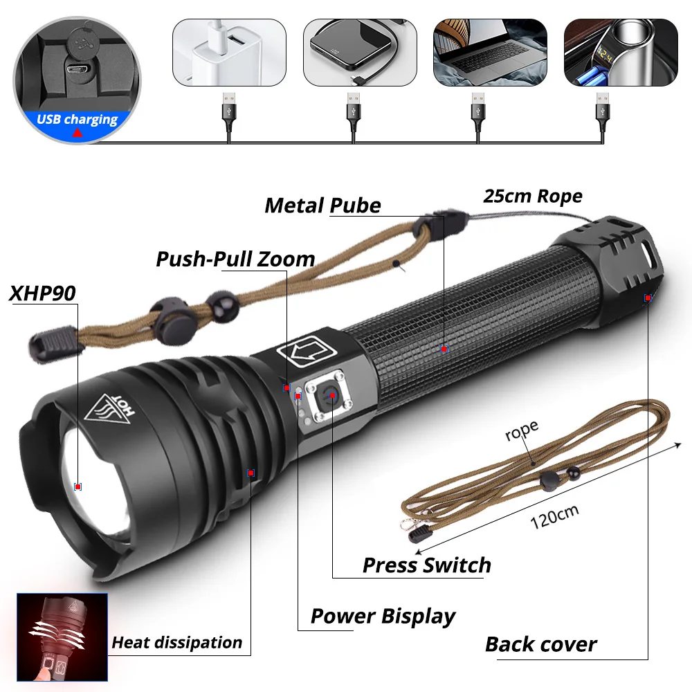 HOT SALE Brightest XHP70.2 XHP90 Rechargeable LED Flashlight Powerful Torch Super Waterproof Zoom Hunting Li